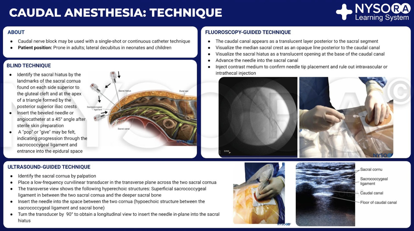 - Palpate to ensure no abnormalities (dimpling, weird hair tufts, etc). Aiming for sacral hiatus. Dural sac ends S2-S3, so avoid that level. Palpate the cornu (coccyx is one point, and then cephalad to that is the 2 sacral cornu). Insert at a 45 (parallel to floor), hit os (coccyx), then flatten to 0 or even –10. Advance through sacrococcygeal ligament. You may feel a pop or not. Aspirate.